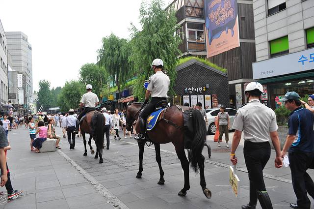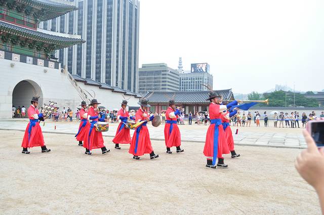 光化门就是古宫(景福宫)的城墙, 光化门以内是古老的景福宫, 以外就是现代建筑林立的市厅. 从博物馆出来, 刚好就碰上了进行光化门交接仪式. 我们理所当然就要驻足看了. 整个历时大概20分钟. 很有趣的是, 在这里看的也有很多中国人, 韩国的工作人员一边喊离远一点(韩文), 中国人听不懂以为走进一点. 工作人员就像麻鹰捉小鸡一样, 赶完左边的人, 右边的又冲出来.