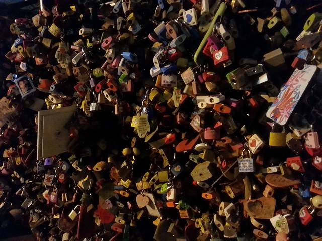 对! 我没有参假. 当我们从排完好几轮队伍后, 来到塔底, 已经天黑了!!! 天黑了!!!! 黑了!!!!! 至于我们拍了多久, 请自个儿想象了. 从缆车下来, 有一个小观景台, 是给不打算登塔的旅客观景的, 是不是很人性化? 再往上等两层楼左右, 才是真正到达塔底, 就是图片显示的地方. "N"字标志往右走就是心形锁的地方.