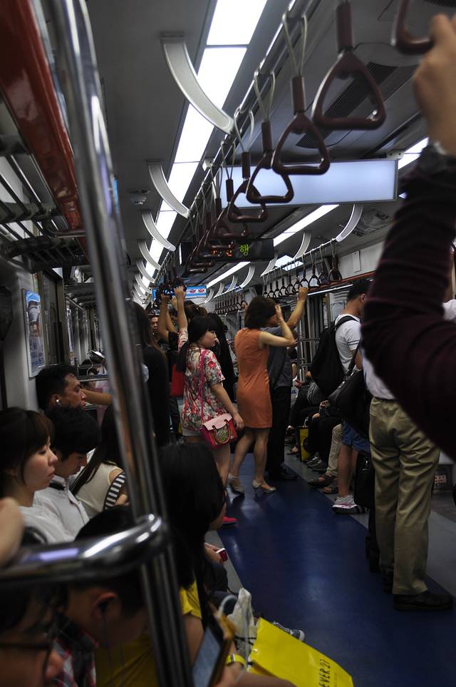 韩国的地铁, 比国内的要宽敞. 所以就算很多人, 也不会觉得很拥挤. 而且韩国的地铁很晚才收车, 好像是到凌晨的一两点. 我想这跟韩国的加班文化很有关系.