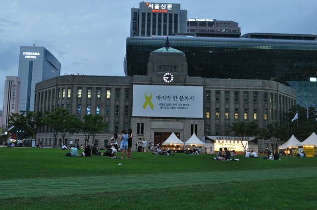 以前白色这栋大楼是原来的市政大楼, 但现在已经改用成首尔图书馆. 后面玻璃的那一栋才是现在的市政大楼. 绿草一片就是首尔广场, 入夜后, 很多情侣, 家庭会去散步.