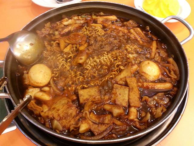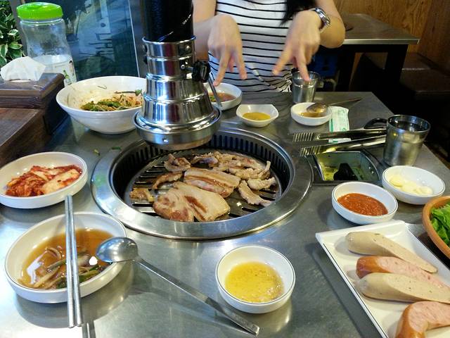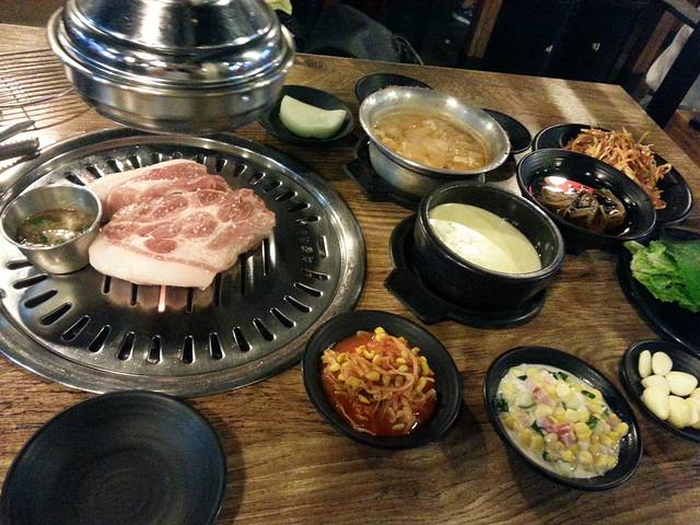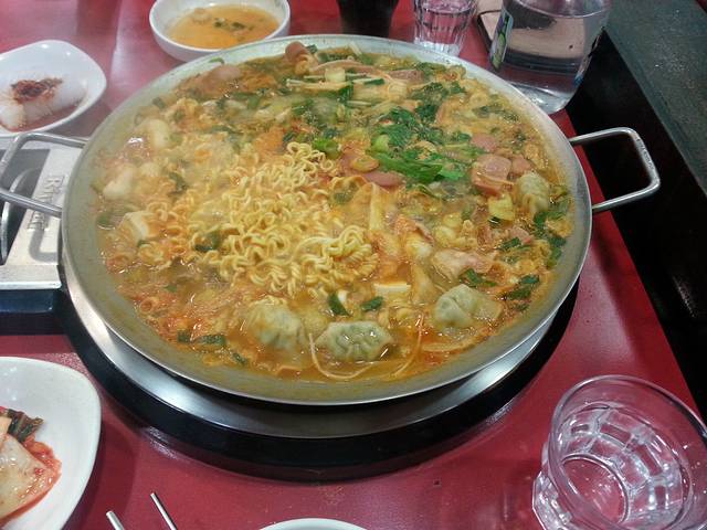 晚餐的地点是根据攻略推荐的部队锅而去的. 略微有一点点失望, 因为真的没有到很好吃, 都是一些速食食物, 酱料也不算特别. 唯一要赞的是小碟很多吧. 价格是两人份19000won, 大概RMB120. 吃饱以后, 我们就回旅馆休息了. 吸取了前一天的教训, 我们牢牢地记住了从哪个地铁口回去, 没有再麻烦路人了.