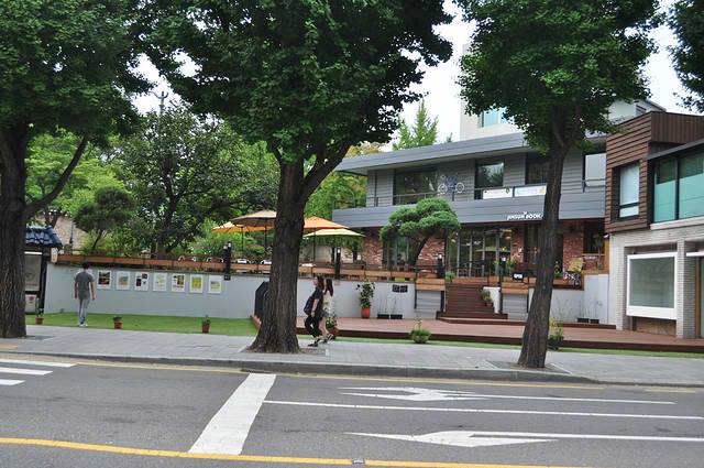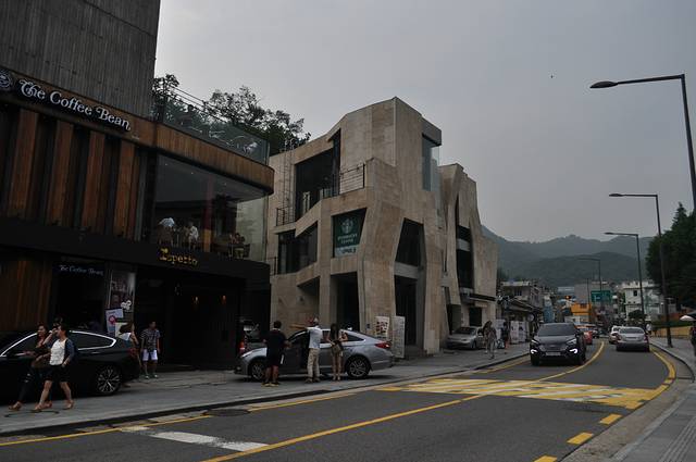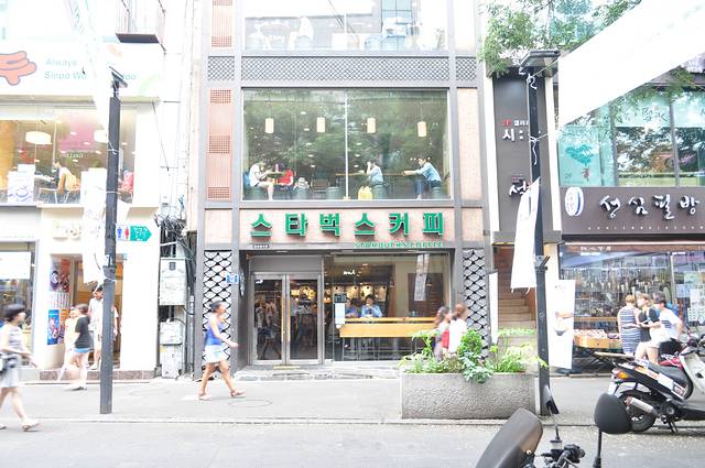在韩国街头, 咖啡店真的不是一般的多. 韩国人应该很爱国吧, 咖啡店大多都是本土品牌, 星巴克算是为数不多的外国品牌. 图中的咖啡店据说是全球唯一一个只用韩语的星巴克(感觉这个唯一有点废话), 没有星巴克的logo, 只有在韩文的招牌下面有英文翻译. 韩文招牌读法是: si ta bag si ce bi. 我能吐槽韩国人能把英文尾音也很认真读出来的坏习惯吗?