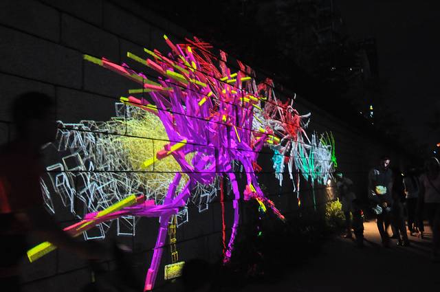 走上了登塔大军之路, 堪比长征. 实在太无聊, 就在这排队的墙边拍下了这张照片. 登上登塔的电梯以后, 电梯服务员会提示旅客看电梯天花. 天花上装这一台裸眼3d 显示器, 播放着从首尔发射冲出地球, 越过大气层, 到达宇宙. 当视频播放结束, 电梯就刚好打开, 到达塔顶. 我真心为这个构思拍掌, 既不用在电梯里待的时间无聊, 也不会担心电梯运行速度过快.