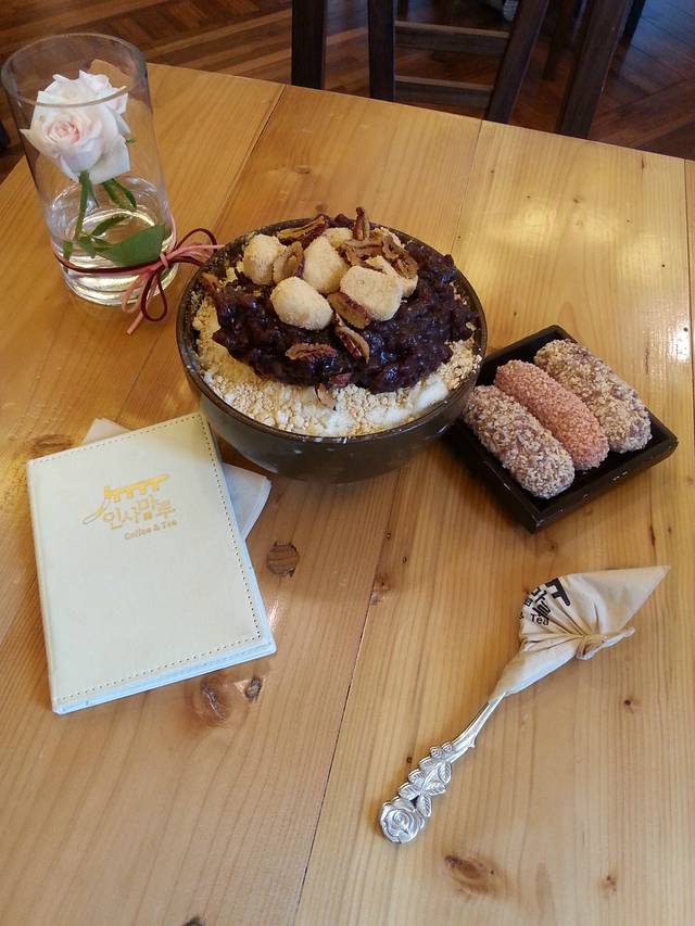 到达预订的酒店, 才十一点, 离check in pm2:00还有一段时间, 我们就丢下行李, 马不停蹄地去找吃的. 来到一家传统的茶店, 吃了一个我感觉这辈子都不会吃到比这更好吃的牛奶冰. 两人份15000won.