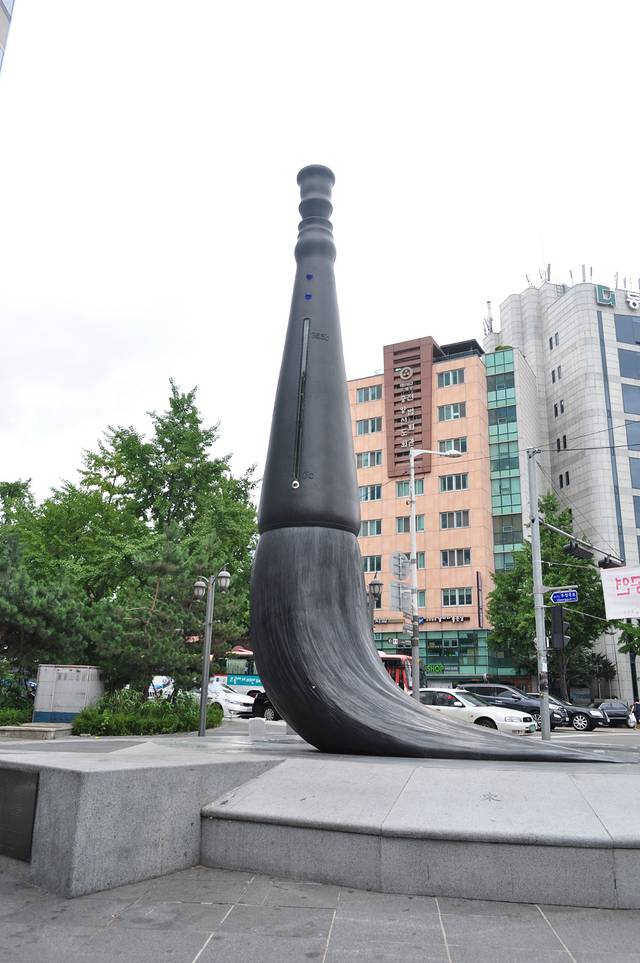 其实, 仁寺洞距离我们住的旅馆很近也就走十分钟左右(我们后来才知道这么的近), 但是刚到韩国为免走错路, 我们还是傻傻地坐了一个站的地铁去仁寺洞. 最近仁寺洞的地铁站是3号线的"安国"站. 走出地铁口没几步, 就能看到这支大大的毛笔, 这是仁寺洞的标志, 象征着韩国的文化. 毛笔象征韩国的文化, 这仿佛bea bea bea 地打我的脸.