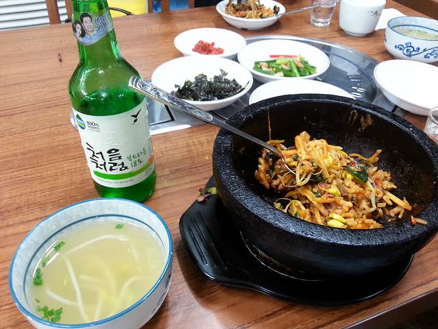 这里的拌饭不是一般的好吃, 但是价钱也不是一般的贵. 一个普通的拌饭要15000won, 大概RMB90. 在韩巢网有这家店的优惠卷, 只限拌饭类打95折. 但是就想着没便宜多少就没下载了. 如果多人吃的话, 打个优惠券还是比较好的. 店面是非常传统的装修, 木桌木凳, 还有一个贵宾房(就是那种坐在地上的韩式房间). 为了追求韩国吃饭的那种豪迈范, 我们还点了一瓶烧酒. 但是把酒喝下口以后, 才发现被骗了, 完全做不出那种爽的表情. 没有一点甜味, 浓浓的就是酒的味道, 而且劲道很厉害, 一下子人就开始晕了, 最后只喝了小半瓶就走了. 韩国真的什么都要明星代言, 连烧酒都要请寅成oba.