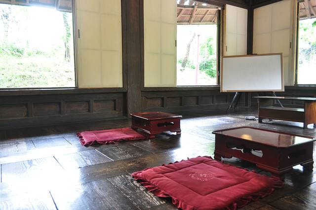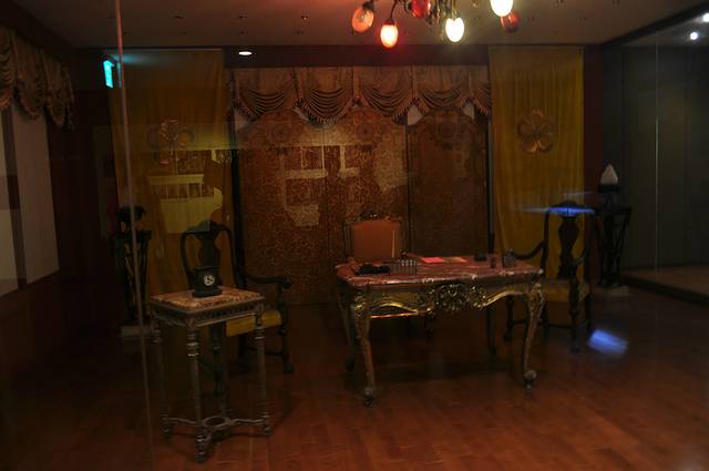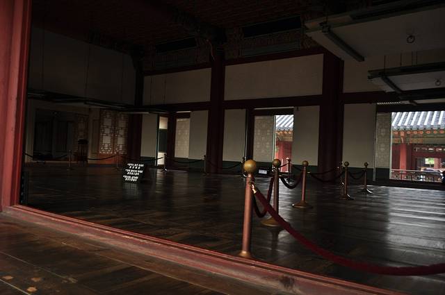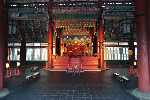 皇帝的龙椅. 韩国君王似乎很喜欢红色. 让我好奇的是, 放在地板上的是凳子, 还是桌子呢?