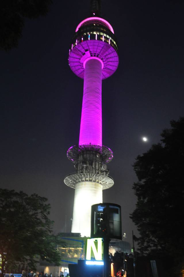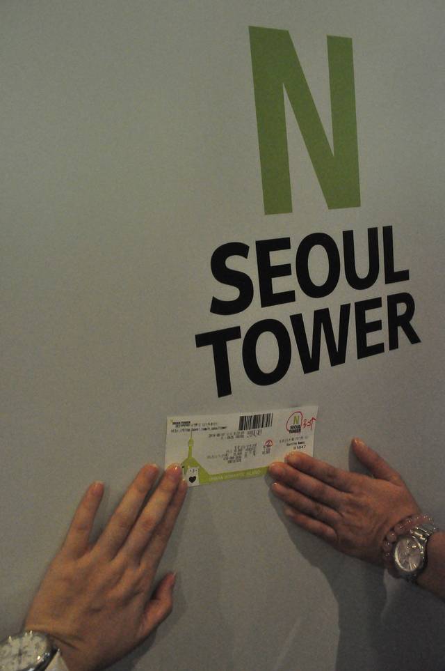 吃饱以后, 趁着太阳还没有下山, 我们赶紧赶到首尔塔. 受星星的影响, 首尔塔对于我们就是一个美好浪漫的地儿. 我们还特地心形锁的位置听着My Destiny, 听起来很脑残吧. 去首尔塔的路也不太好找, 坐4号线到明洞站3号口出, 一直直走到一个非常大的十字路口以后左拐, 看起来会有点荒芜, 还会看到收费站, 那你就没走错了. 再往前走你会看到有一条长龙在排队, 那是坐电梯到缆车的乘坐点. 如果不想排队可以选择走左边的路到缆车乘坐处. 我们因为太多人在排队, 所以还是选择走走吧, 大概走5到10分钟(有一条非常长的楼梯), 就到了缆车售票处. 就这样我们就展开了长久的排队之旅. 因为买缆车票要排队, 乘坐缆车要排队, 买登塔票要排队, 登塔要排队, 甚至下塔还要排队. 反正我们粗略算了一下, 单单排队也花了3个小时. 不过可以放心的是, 首尔是个不夜城, 前面说过地铁营运时间到凌晨1点左右, 我们大概是10点左右坐缆车下山的时候, 还能看到不少人登塔, 安全问题还有交通问题就不用担心了. 费用: 缆车来回17000/两人, 登塔费用18000won/两人, 折合人民币总共210元/两人.