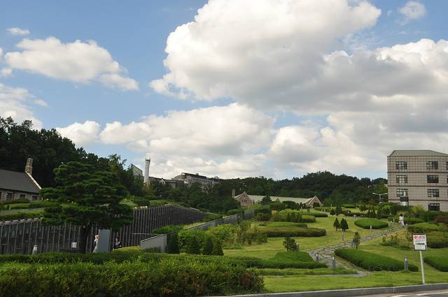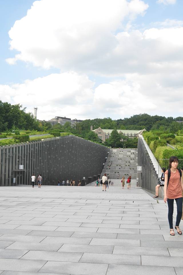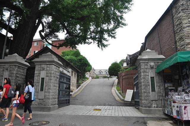 梨大吸引我的是全女子学校这个特色. 对于作为一个土鳖的我来说, 一个只有异性的学校就是一个特别的存在. 其次就是梨大外的商业街, 去之前看了不少攻略说梨大外的商业街买东西很便宜, 也想去一探究竟. 来到梨大以后, 最大的感觉就是小清新, 蓝天白云, 花园式的校园环境. 到梨大, 可以坐2号线到梨大站2号口出, 然后往左边的商业街一直走, 就能看到梨大. 梨大没有明显的门口, 除了梨花壁画还有一个不明显的校名标志以外, 它就几乎和商业街混为一体.