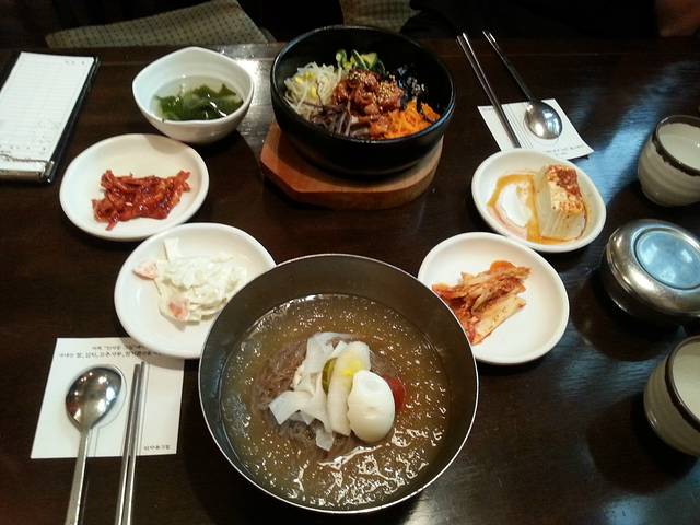这是我们真正意义上的第一顿韩食. 周围的都是点餐所送的小碟, 没有印象中的八小碟, 但是泡菜真的是必备的, 在以后的每一顿都能看见它的身影. 我们点了一个冷面, 和一个石锅拌饭. 看得见冷面的周围的冰块吗? 真的是很实在的冰, 一口咬下去透心凉. 冷面很韧, 工作人员会提供剪刀, 让你把冷面剪开再吃. 但是我们什么都不懂, 傻傻地一口吃下去却咬不开, 只能硬吞. 后来才发现桌边的剪刀是干嘛用的.