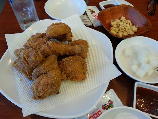 在韩国挺出名, 在国内某些城市已经有分店了. 很实在的一只鸡, 16000won 一只, 大概RMB96, 还附送了酸萝卜除油腻.
