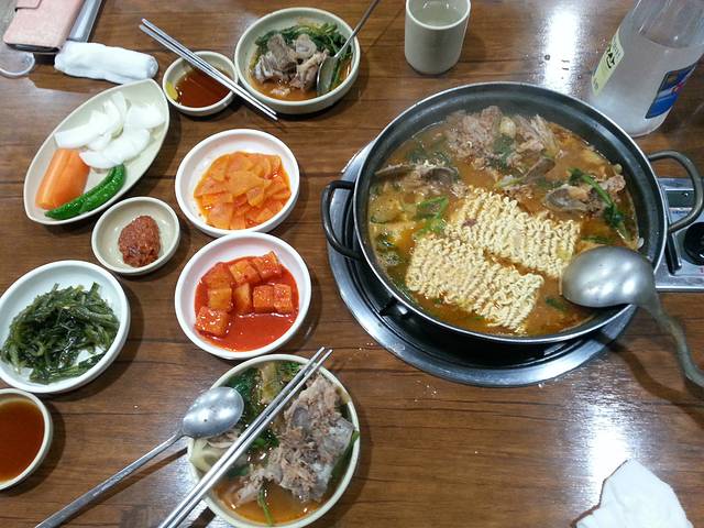 赶回旅馆附近已经差不多八点, 随意进了一家餐馆吃晚饭. 猪大骨汤据说是济州很出名的菜色, 但是对于广东人来说, 这无疑就是在吃汤渣.