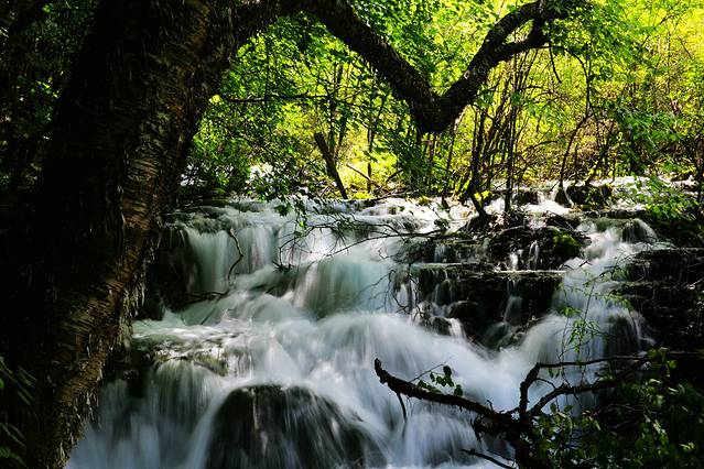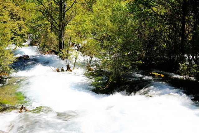 检票进入又排队二十多分钟等候乘车,总算挤上了车,已经八点过了,大家终于松了口气。九寨沟看景点是个Y字型,说是自己选从哪边看,人多也由不得自己,拉到哪边就从哪边看。还好把我们拉对了地方。我们去的最高点是原始森林,车上服务人员介绍,如果不是特别爱好建议不去原始森林,从箭竹海下车往下走,现在还早,人不多,不然等看完原始森林回来又会遇上大队人马,多数人下车。