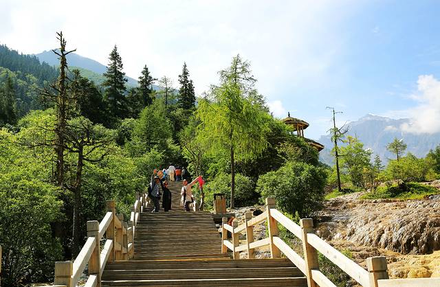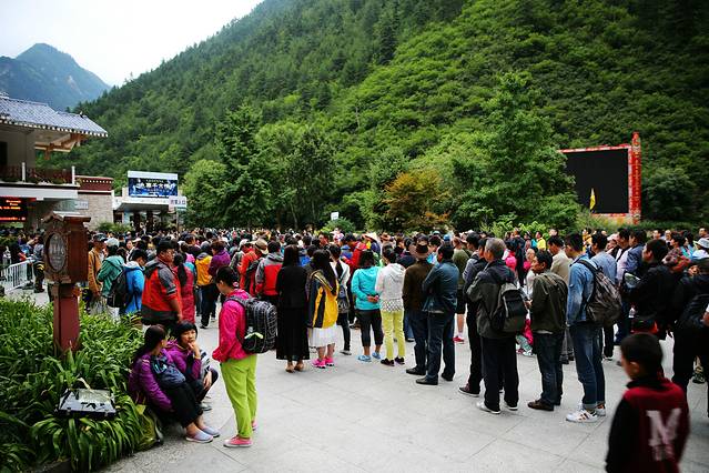 早五点起床,不到七点就到景区门口,四人也分工好,我停车,会计去取网订票,另两人入口排队。没想取票也几经波折,门口排队,网订票在二楼,又随人流冲上二楼继续排队,听人说自动机处可取票,赶快到自动取款机去取,又无法打出票,返回原队处又是吵吵闹闹,等把票取出了才知道没有订观光车票,会计哪里吃过这等苦,说不看了卖票走人,劝说,还好,观光车票在自动售票机处顺利买到,不然靠排队买,少说也得一二个小时。如果自驾去九寨沟,强烈建议头天赶在景区售票下班前把门票搞定,并拿到手。