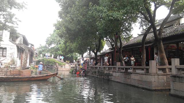 这是站在周庄入口处外的桥上拍摄的,河的两岸满是商家店铺,在拍摄点100米处就是检票口。
