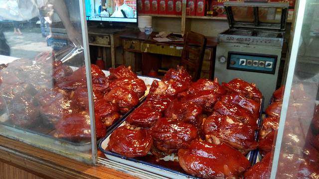 很多店面在前店后场,制售一种酱猪肘,周庄人名之“万三蹄”,据说是江南巨富沈万三爱吃的一种美味。