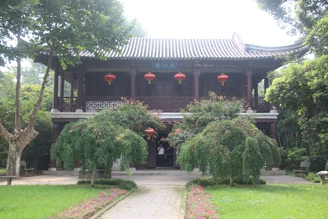 不远处就到了文心阁。文心阁为二层歇山清式建筑,内部则按现代实用的要求进行装修,为文心阁题名的是龙学泰斗杨明照老先生。我就很喜欢这种古典的建筑。多有韵味啊······