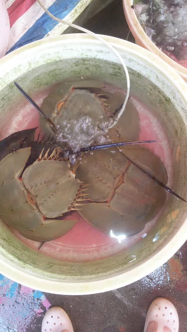 中华鳖,国家保护动物,只有在黑市上才能买到,涠洲岛就是黑市,血是蓝色的,传说可以抗癌,请与旁边那双成人的脚做对比,不小吧!30元一斤的价格,有木有想买的冲动