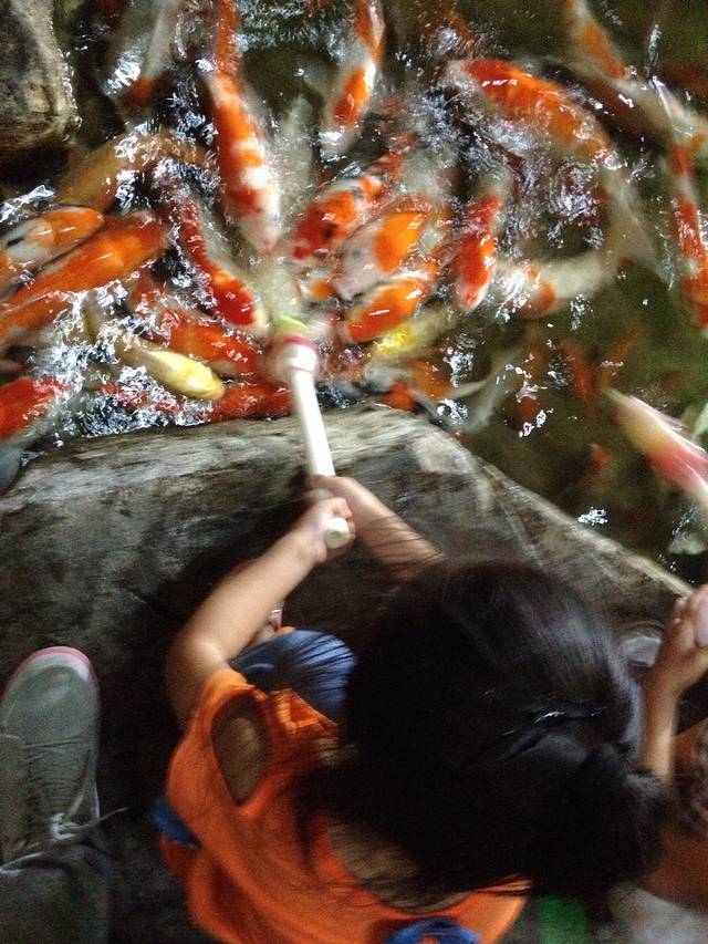 先到了热带雨林,进去会有大喇叭在叫会吃奶的鱼,俩妞忍不住也要试试,花了二十元大洋给她俩买了俩奶瓶,喂鱼去了