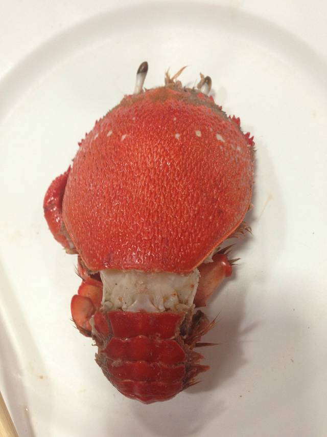 完全是螃蟹,就是在螃蟹尾鳍的地方,长出了一截子虾尾巴。整体鲜红,比一般螃蟹红。