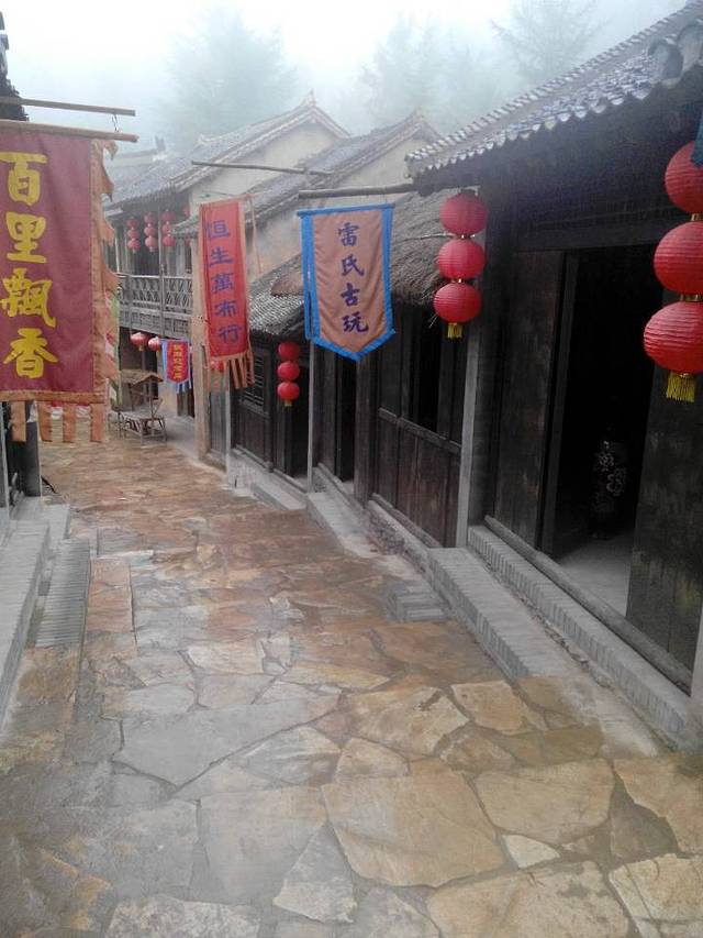 我们沿着盘山公路到达抱犊寨,当时天降小雨,一群人化身“蓝精灵”走进古寨。
