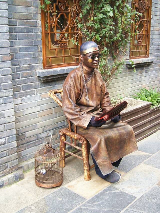 假扮的铜人,不时会动一下,吓吓过往的游客