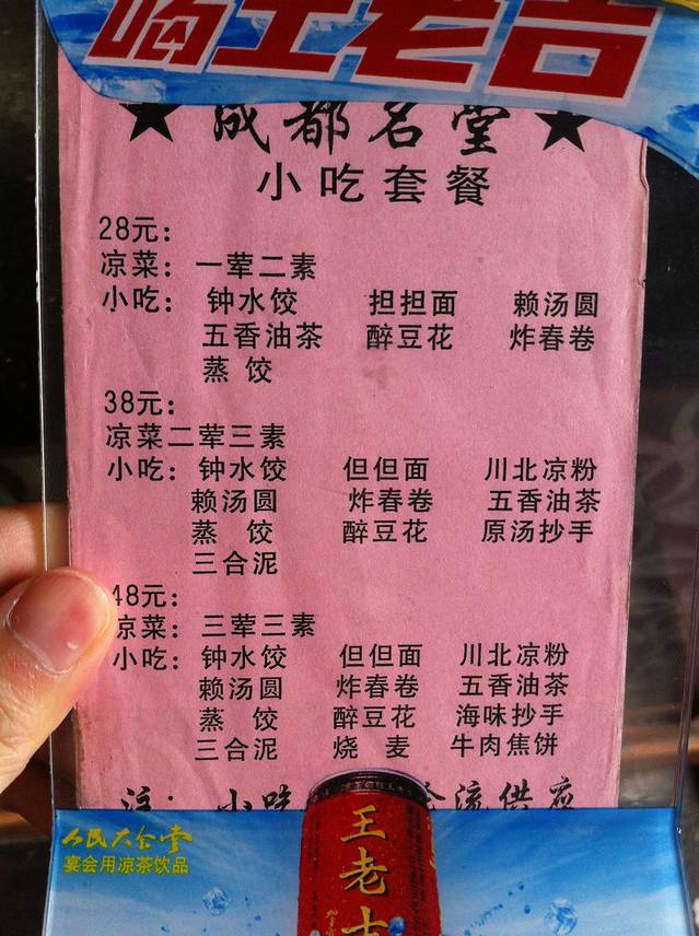 这家算是老字号了,味道可以保证,但服务还是像80年代的国营餐厅一样的差,服务员各个脸那么长。说说吃的,来成都的第一家店,就点了小吃套餐,每个都一小份的尝个味道,虽然很多人不推荐,但对于我们胃小又馋的人来说不失为一个好选择,先试个大概,再单点喜欢的。