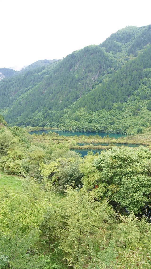 正好还在修栈道,不能下去看,隐隐约约的看到几个海子藏在林子里。