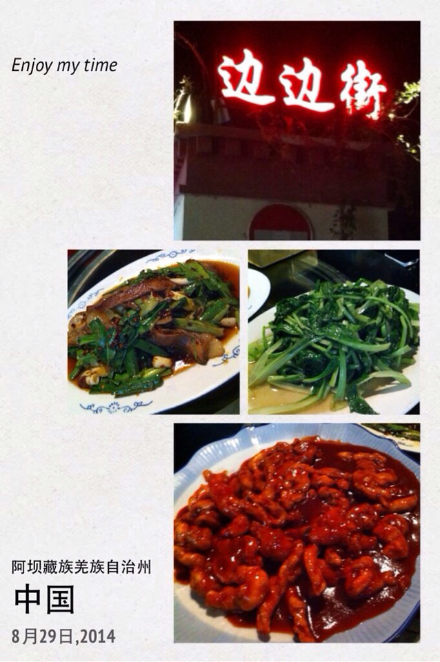 航班延误两小时,从九黄机场到宾馆差不多已经快晚上九点了,放下包就去宾馆后的边边街找吃的,和想象的完全不一样,冷冷清清的人都没有,还不如在机场来的路上热闹、店多呢。不过既然来了就找个填饱肚子,这家家常菜的店价格是不便宜,但量超多,味道也可以,结果还算满意。