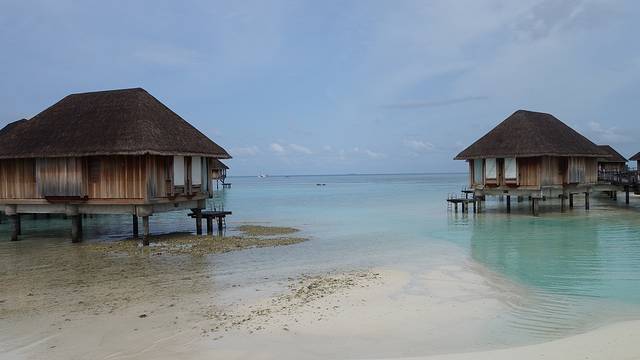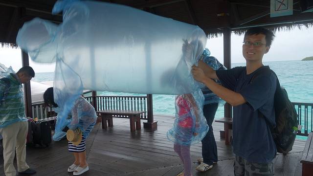 回屋的路上发现,雨停后,海水退潮得厉害,离岸近的水屋下方露出大片的滩涂。