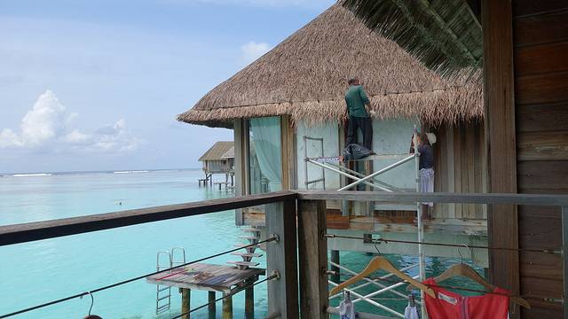 雨停了,旁边的工人继续工作,旁边的水屋在修葺屋顶,纯手工打造屋顶的手艺头一回看,偷拍留念了。