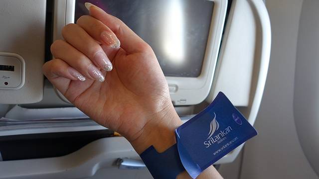我无聊用斯里兰卡航空的行李绑带绑住手腕,文汪汪说,这就对啦,我是他的一个行李嘛~