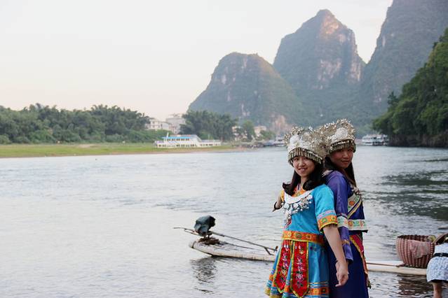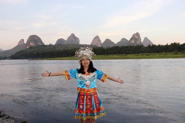 吃饱毫无目的到处走走!后来去了漓江边走走,看到租民族服装的,和老板租了两套杀价到15