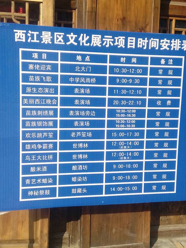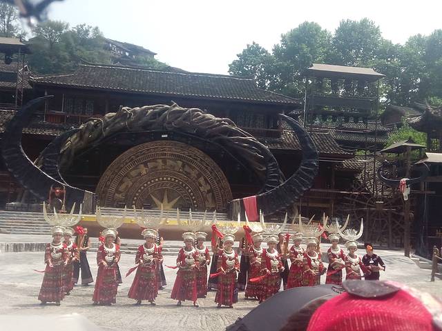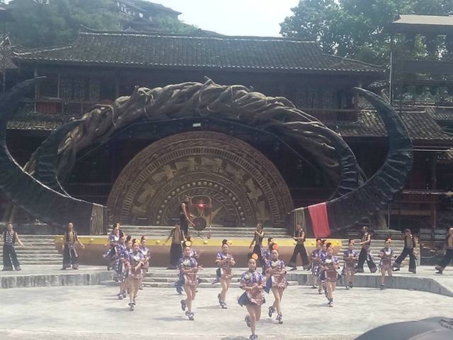检票后,先坐观光车(门票包含)到寨口,再走路去旅店。拉着行李箱,有点不方便,还好里面东西不是很多,提提拉拉,顺利到达。整理下,随便吃了点东西。问老板表演,老板说,赶紧去,3点开始,现在快结束了。果然,到的时候,已经谢幕了。还好,一天两场,可以看明天早上的。晚上也有表演,不过要另外买票,内容当然不一样的。