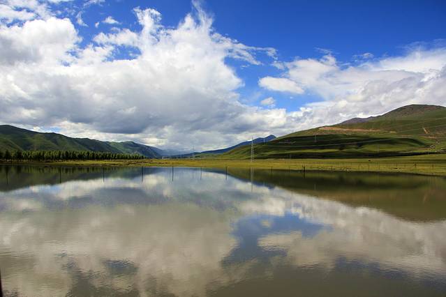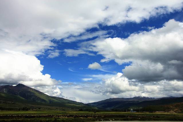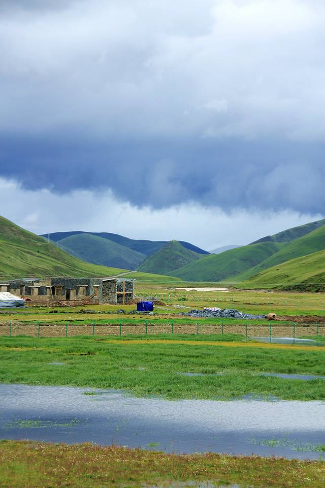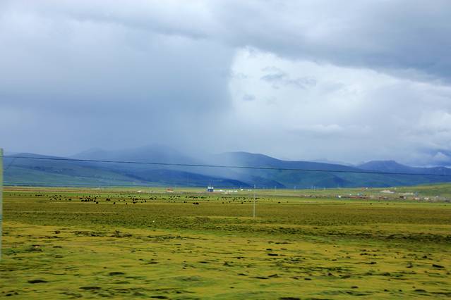 路过理塘,大片沼泽地,远处正在下暴雨,这在高原很常见