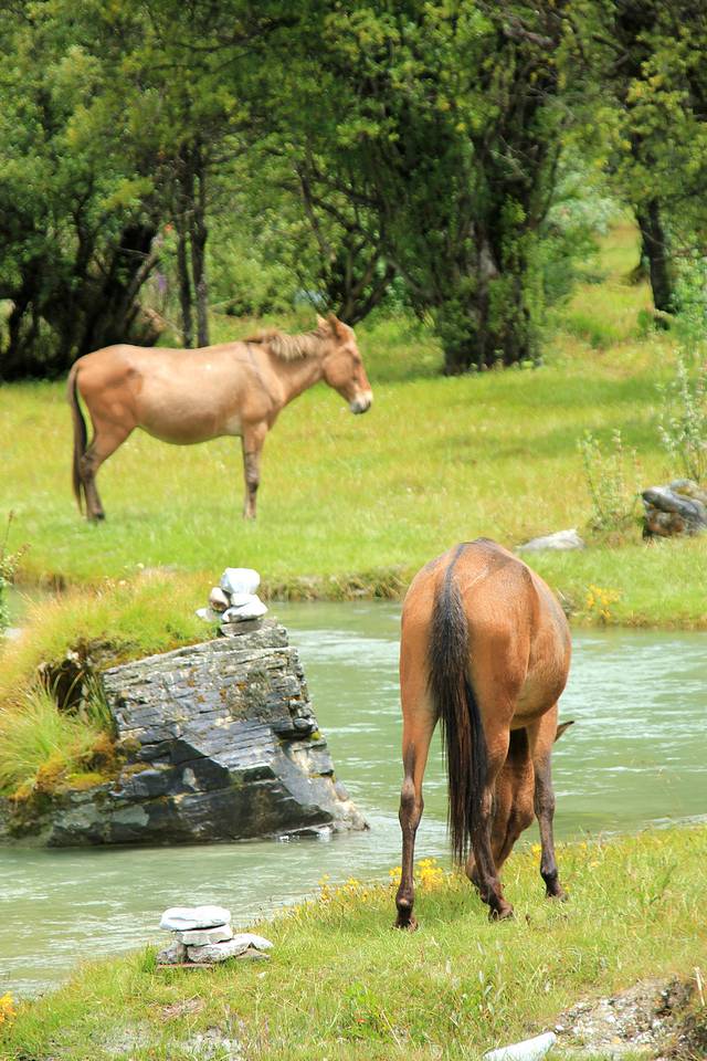 景区内的草原上随处可见散养的马和骡子。