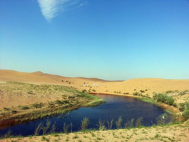 第三站 包车80元(往返第二天回) 前往腾格里大沙漠 门票加篝火晚会100元(区内套票240元包括骆驼 马 越野车等等)免费滑沙 要走很远 没什么意思。沙漠露营(场地费60元) 进入沙漠之后 可看到刺陵客栈(电影刺陵拍摄地)非常适合拍照的地方,不远处有个小沙堡。正好赶到了中午 所以没考虑太多 直接徒步进入了沙漠 真正体验了暴晒。月亮湖很美 水清澈见底。