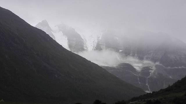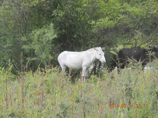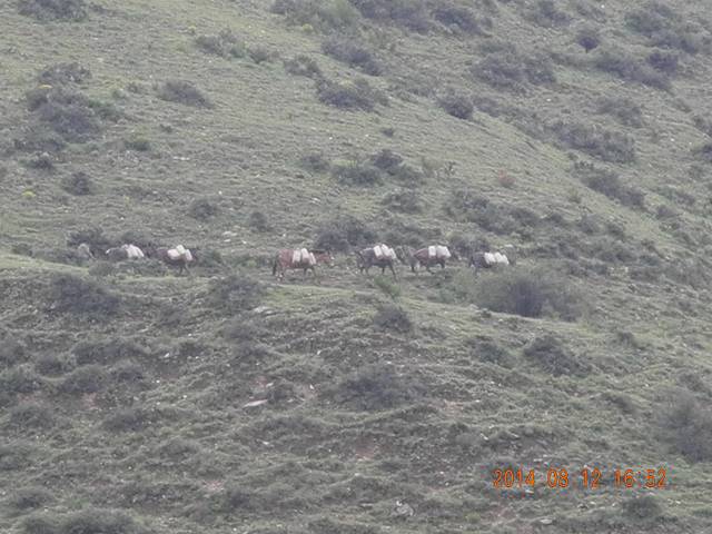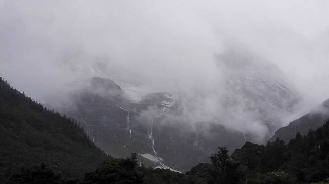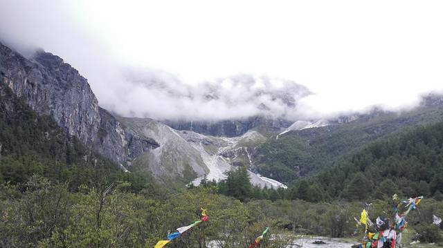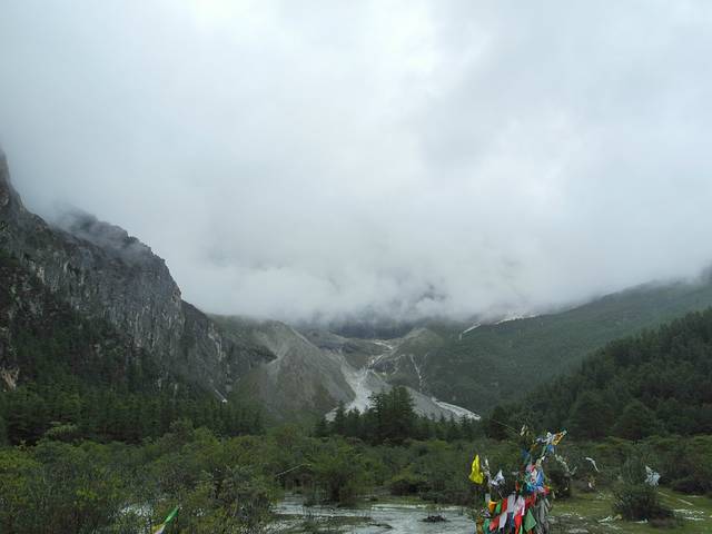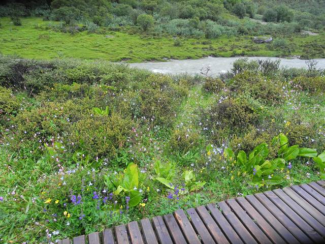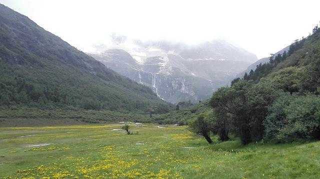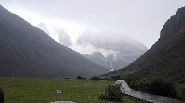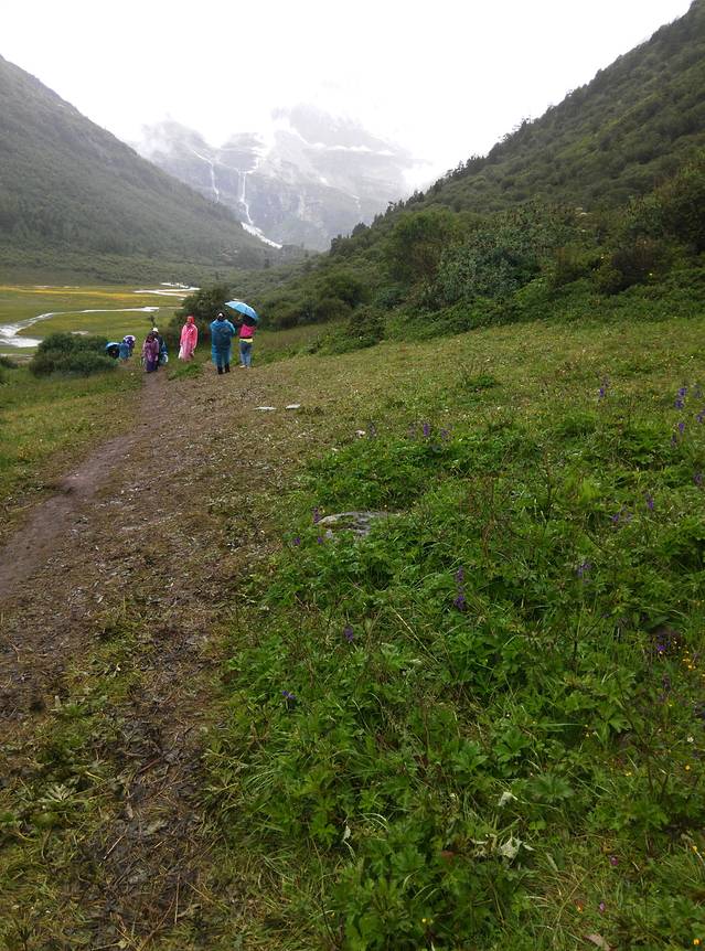 阴雨绵绵,三大神山若隐若现,各色野花争奇斗艳,探奇的第一天上午。下午雨越下越大,天气湿冷,露在外的手都又木又僵,但受苦值得,三大神山都在不同的时间在不同的角度露出了尊容,我们还是有缘人!由于身体原因我们并未骑马去朝拜五色海,牛奶海,只是沿着马道向央迈勇靠近了接近1km,从另一种角度欣赏到了洛绒牛场的艳丽和宁静。夜宿亚丁村稻城连锁酒店,遇上停水停电,自力更生带领下一代体验原始生活,接冰凉清澈的山泉水冲厕所,购买藏族老乡的开水10磅/瓶/10元。受邀与酒店工作人员混吃晚餐一顿(因无水无电,团餐费退给我们)。其中一人因肠胃不好,身体虚弱,事后都担心能否活着回去,好在经过一晚的休息,都基本挺过来了。