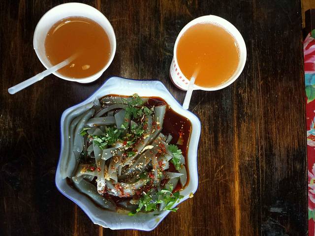 云南的天气真是很奇怪,下午4点多从束河返回的时候,天,下起了倾盆大雨,庆幸的是,我们在车上,呵呵,回到古镇,继续晃荡,找到了阿哩哩,点了土豆饺子、鸡豆凉粉,酸梅汤和炒饵块。。鸡豆凉粉不错。。