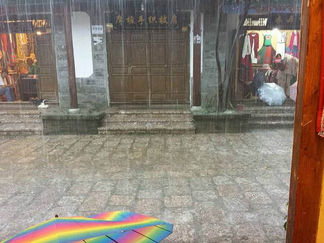 云南的天气真是调皮,刚刚还晴空万里,转眼瓢泼大雨还伴有冰雹,在躲雨的小店一人入手两件民族风棉袄,就拜托店老板快递过去了,也许我还没回家衣服就到家了。