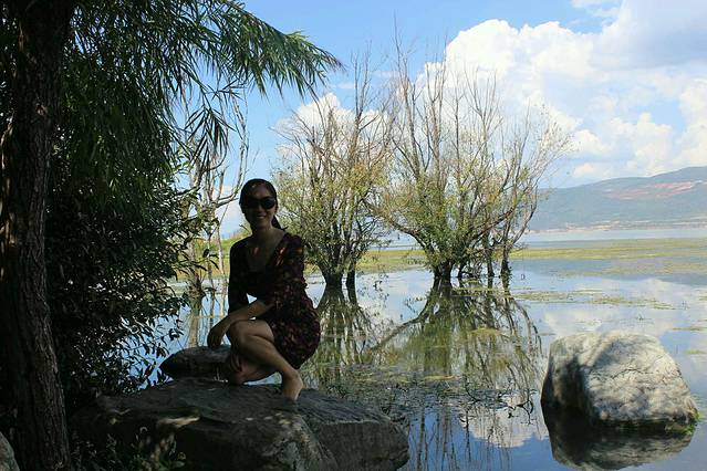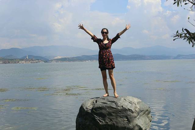 中午稍作休息在客栈吃饭后就到洱海边溜达,2点多太阳光很烈啊,但真是天气好,景好,怎么照都好看,海边还有一群人在游泳戏水,很是愉快,我们顺着小路一路走一路拍