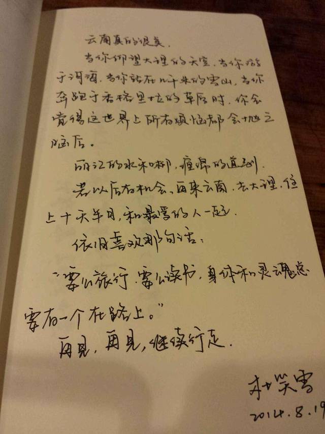 晚上继续逛古镇,收获5条披肩,有礼物有自带的,很喜欢,慢慢溜达到阿安酸奶,一人一杯原味,和丁丁味道差不多,还便宜,随手翻看桌上的留言册,各种旅行感慨,情感抒发,玩笑调侃,有的真的引发共鸣,来丽江的人,各有各的出发点,或为放松,或为逃避,或为寻找,但最终都会在蓝天白云中寻找到此行的意义!