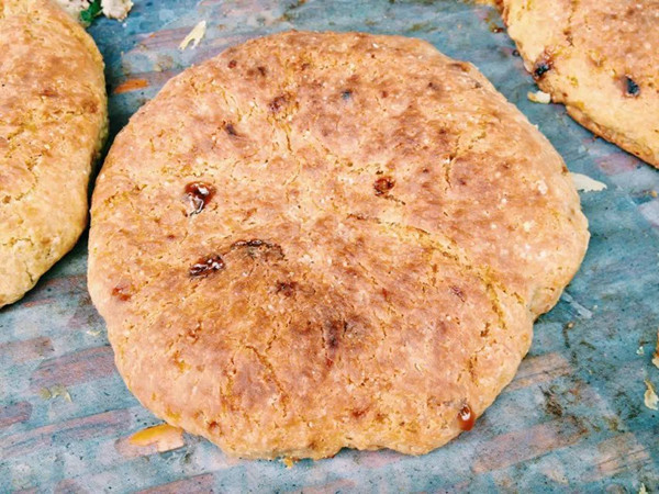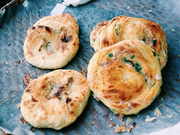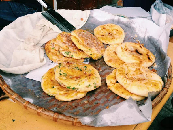 喜洲粑粑有甜、咸两个味道,甜的里面加了玫瑰糖,咸的里面加了肉末和葱花。