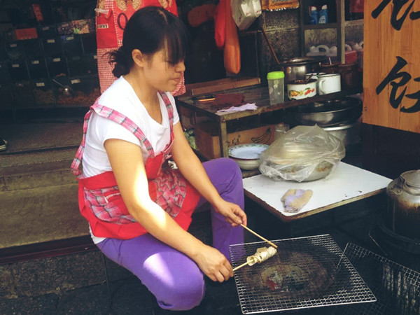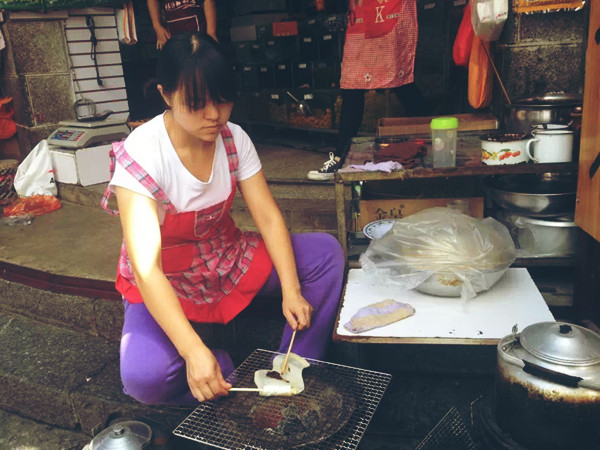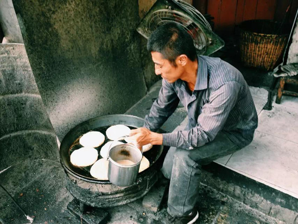 老板帅气的一扔,把粑粑全都弄到里面,再刷上油用炭火慢慢烤,每过几分钟就要涂一层油,直到把粑粑烤得又酥又脆。