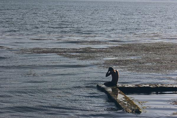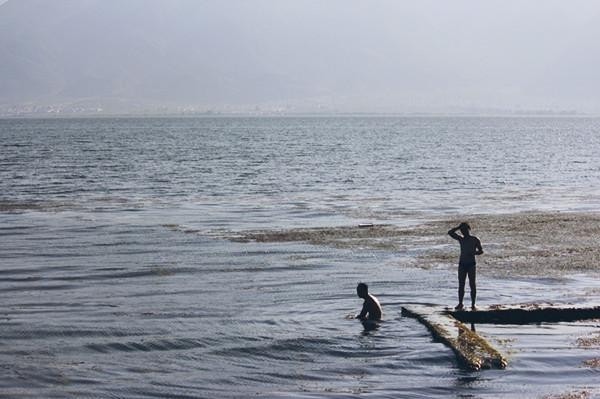 发现一群小孩在洱海边游泳。
