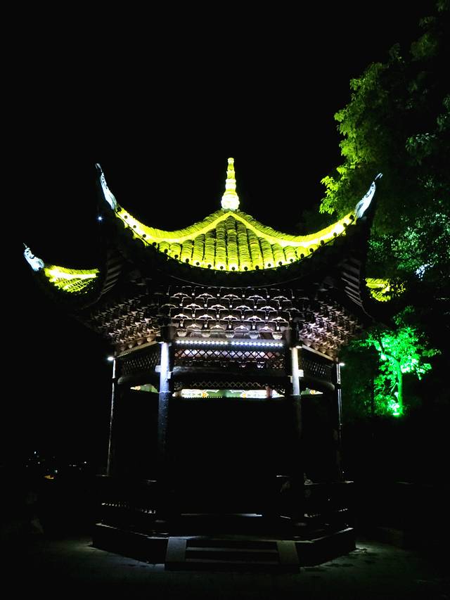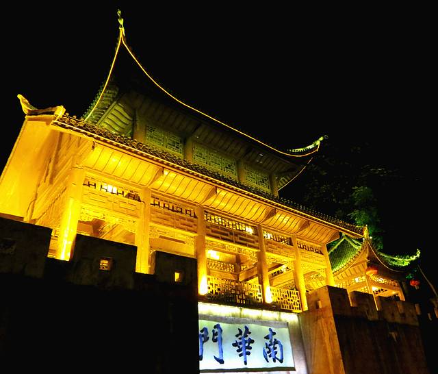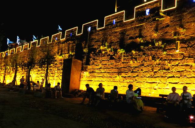四个烫金大字,原来枕的就是镇远屏风西屏山。那天晚上,和老板、房友三人在客栈顶楼夜色里享用完晚餐,夜爬西屏山的心怎么也压抑不住。经过一番心理挣扎,果断抄小路上山,人生第一次夜里爬山。山腰四宫殿老人叮嘱我们一路向右,通往山顶苗疆长城的路比较黑,建议我们向右往观景台走,从青龙洞下山。兴许是走错了小路,沿路越来越冷清,就连原先走在前面的几个人也不知何时不见了踪影。我们就这样一路恐惧又期待地前行,一晃神居然走到了山顶苗疆长城。