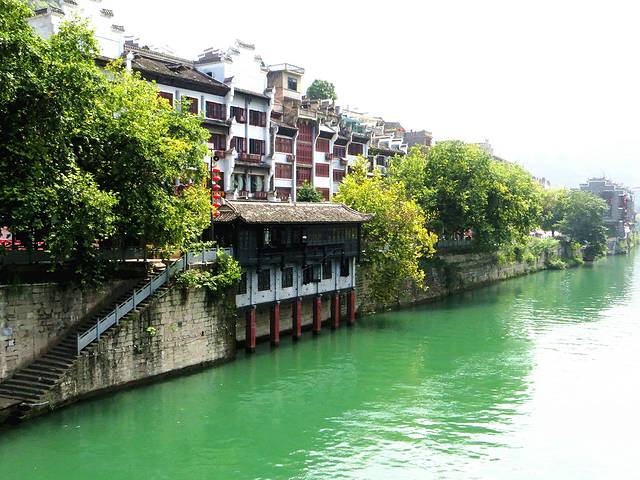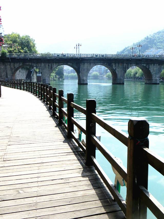 舞阳河的水是一种很干净的绿,就像一条翡翠似的腰带别在镇远古城上。