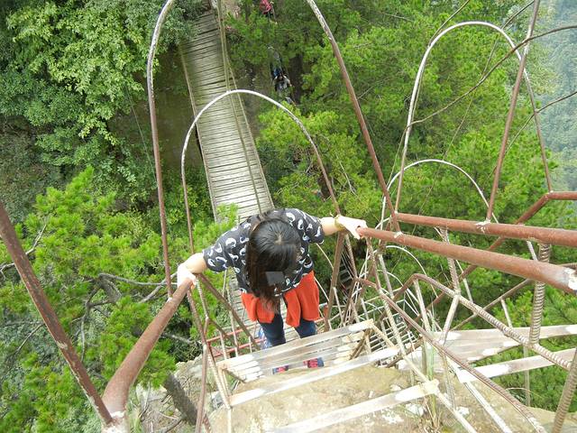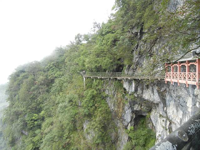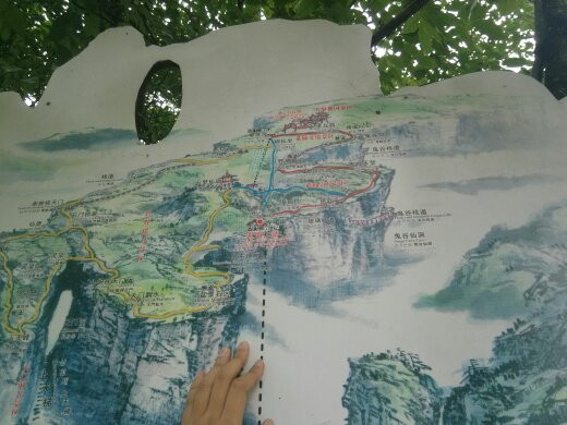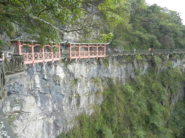 (2)下了缆车到索道上站,我们又爬上了最高点,云梦仙顶观景台,之后就开始西环线的景点:鬼谷栈道和玻璃栈道。还好我们胆子还是挺大的,腿居然没软,还睡到上面照相,再一次吓到了韩国的大妈团。
