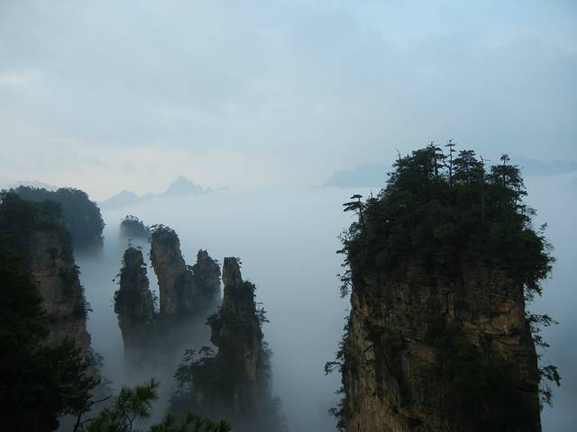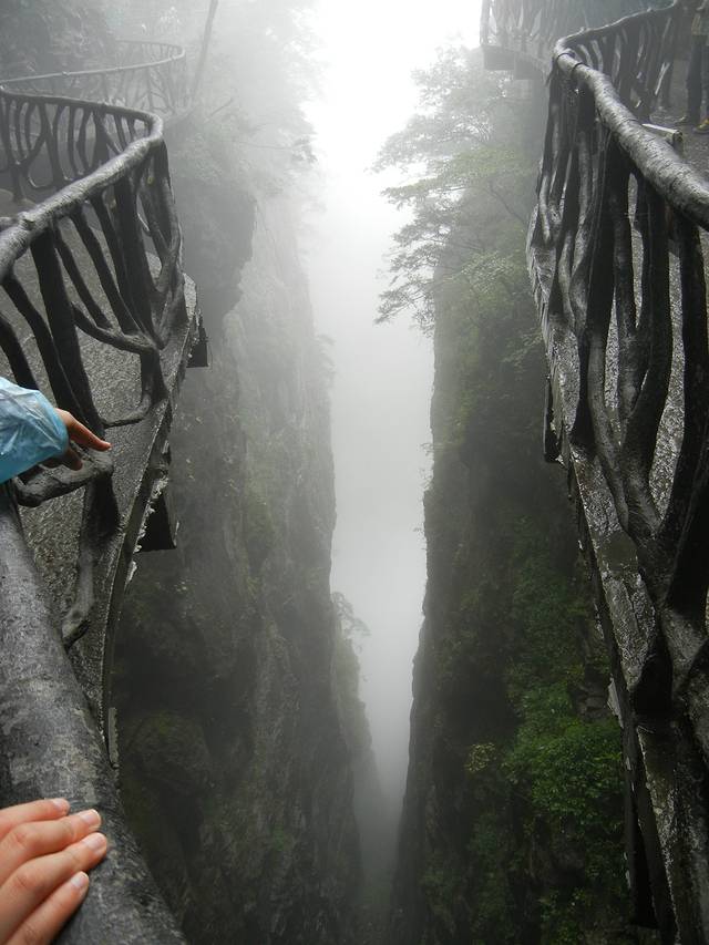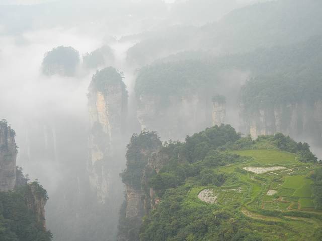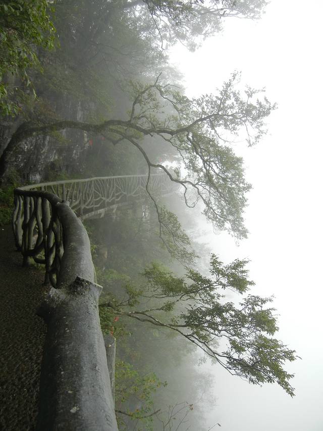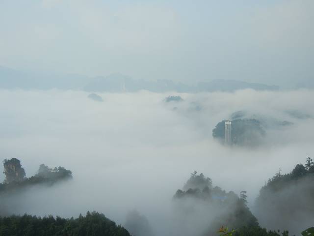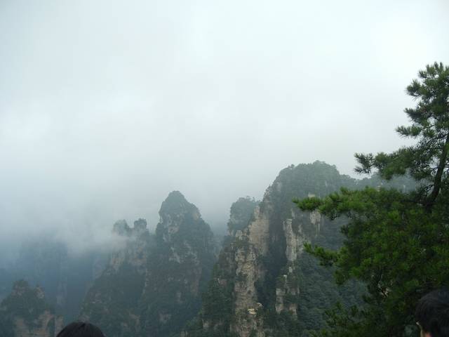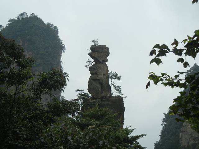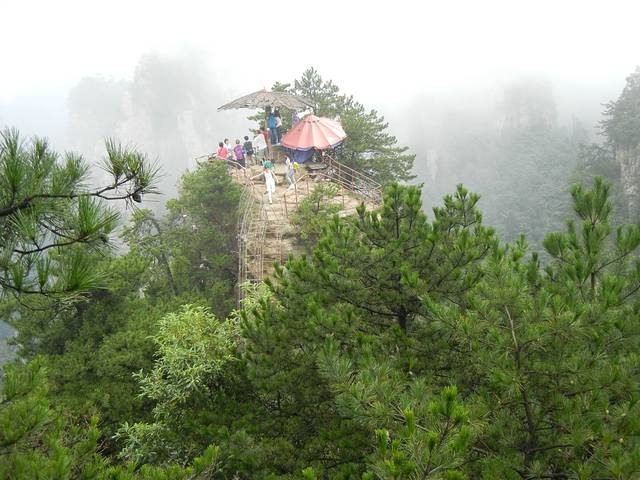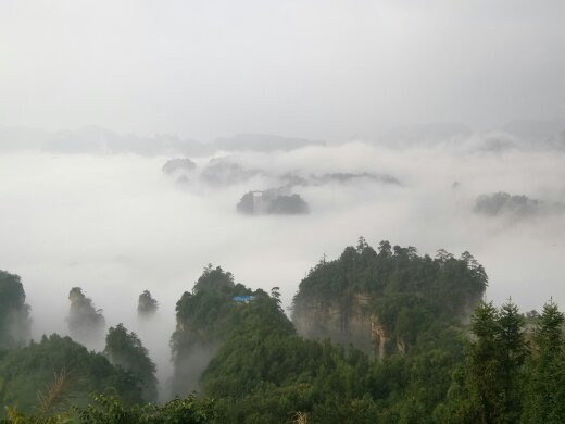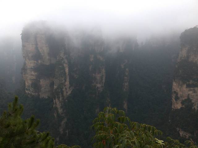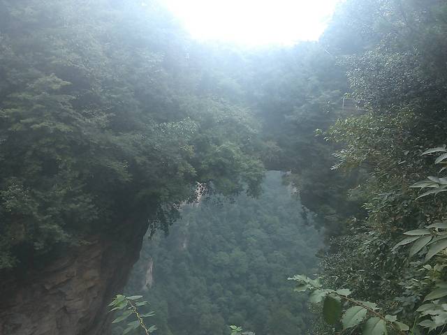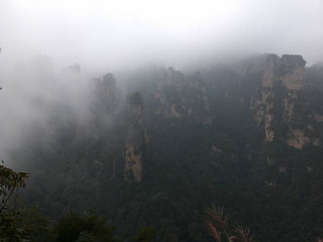 (1)早上出发去武陵源区的路上下起了超级大暴雨,我们拿出来准备好的雨衣,沿着金鞭溪出发,经过乱串坡(3000多个台阶,如果想省力气就继续前进搭乘“白龙天梯” )爬上袁家界,结果发现山上起了大雾,白茫茫的一片,但是随着靠近山顶,雾慢慢的散去,爬上山顶,站在云端上,才发现,这个原来就是人间仙境,雾中若隐若现的景色,实在是美的无法形容了。跟晴天看着光秃秃的石头山相比,这个云海雾海中的张家界又是别有一番风味了。