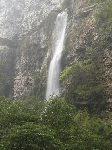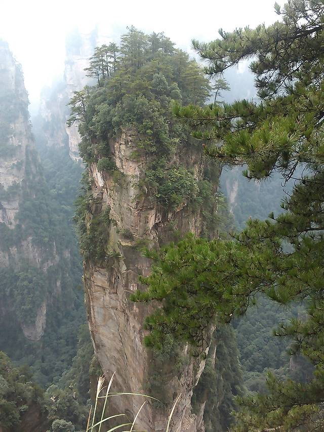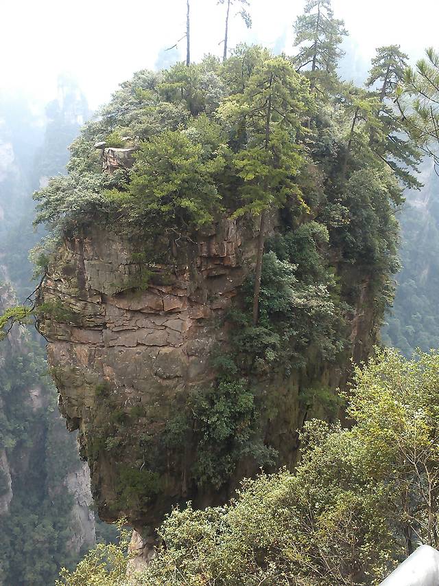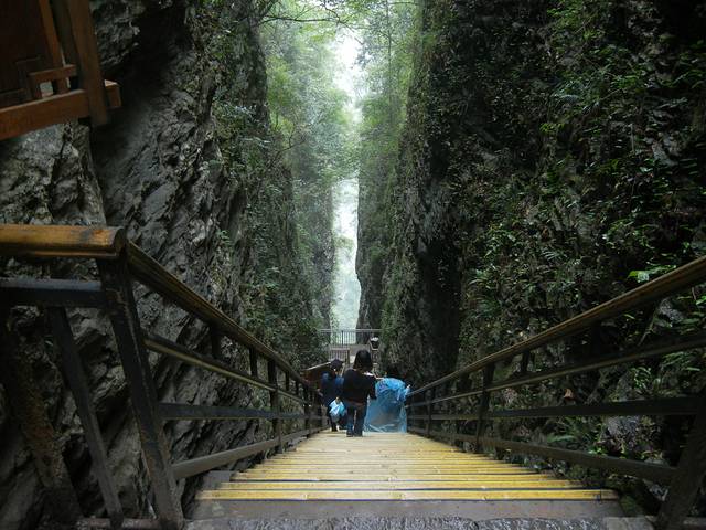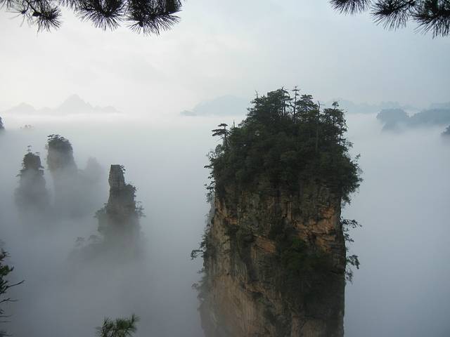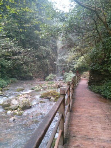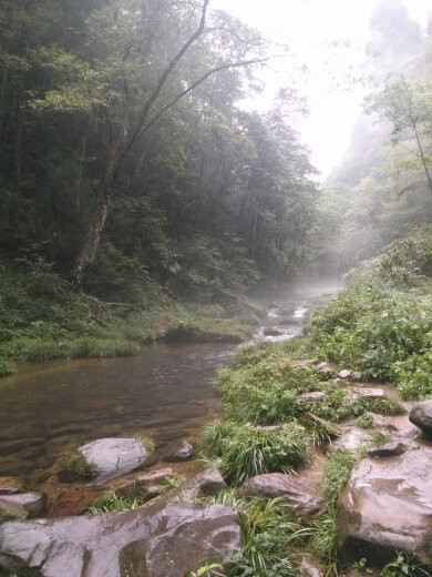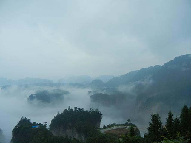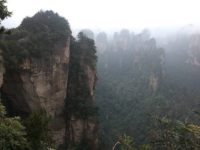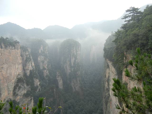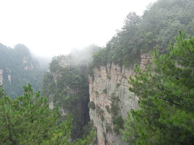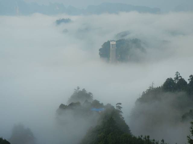 (1)早上出发去武陵源区的路上下起了超级大暴雨,我们拿出来准备好的雨衣,沿着金鞭溪出发,经过乱串坡(3000多个台阶,如果想省力气就继续前进搭乘“白龙天梯” )爬上袁家界,结果发现山上起了大雾,白茫茫的一片,但是随着靠近山顶,雾慢慢的散去,爬上山顶,站在云端上,才发现,这个原来就是人间仙境,雾中若隐若现的景色,实在是美的无法形容了。跟晴天看着光秃秃的石头山相比,这个云海雾海中的张家界又是别有一番风味了。
